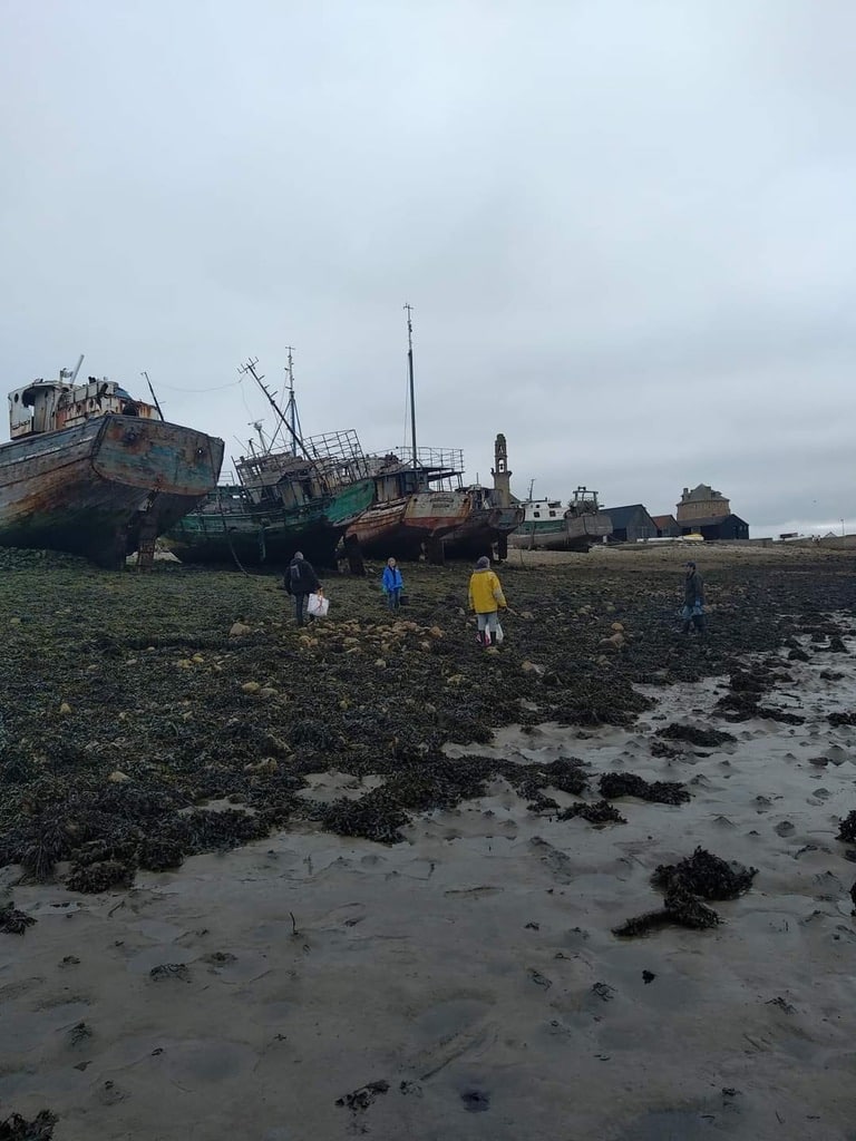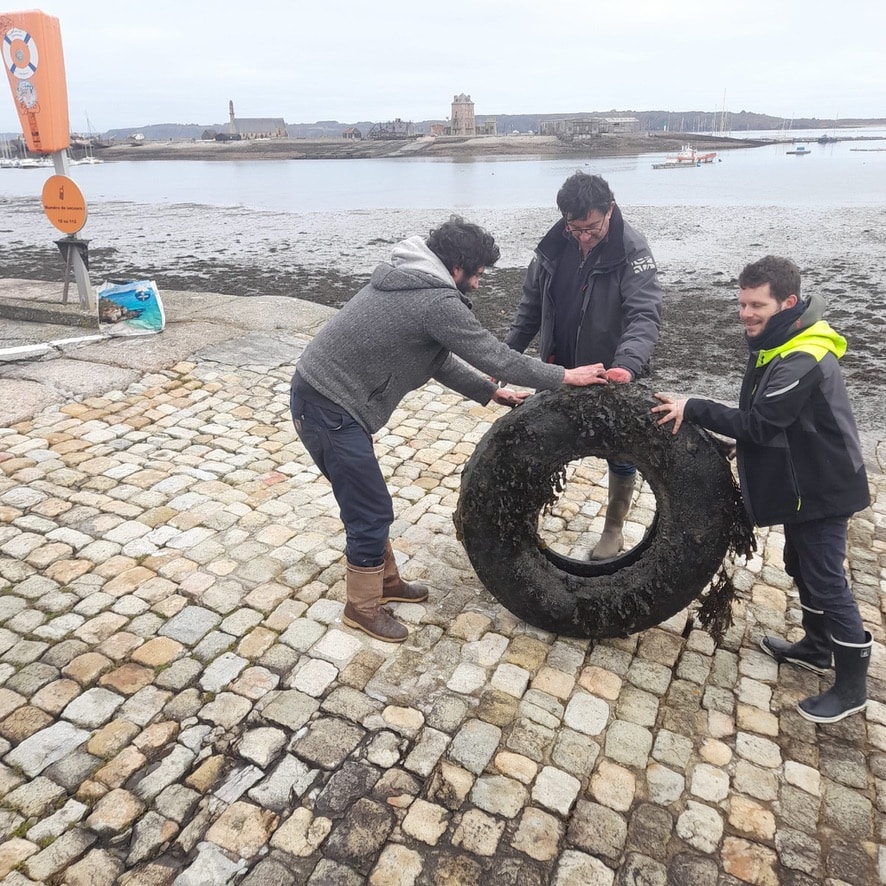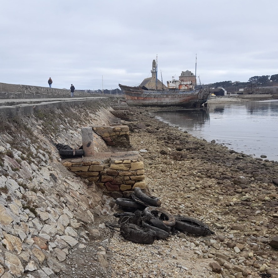 En cette fin de matinée hivernale, sur le port de Camaret-sur-mer, des remorques sont pleines de pneus, de bouts, de morceaux de fer, de plastiques et de débris de verre. Mais autour, une bande de Camarétois en cirés et bottes rit joyeusement et se réchauffe les mains.